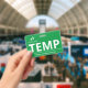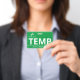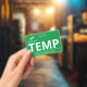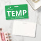 Vertical temp badge with a simple design in white against a green background. Large clean letters makes it easy to quickly recognise the temp as such. Personalise with your business logo.