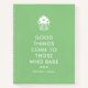 Chic recipe notebook in green and white with "good things come to those who bake" written on the cover in a modern font beneath a white cupcake with frosting decorated with little hearts. Personalise with your name.