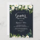 This green white floral royal blue gender reveal party invitation is perfect for a rustic baby gender reveal. The design features elegant watercolor white peonies with green foliage in a dark blue background.