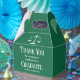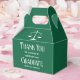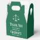 This modern custom law school graduation party favour box features the college graduate name in elegant white script on the green background for the class of 2024. Customise with your university under the scales of justice with a graduation thank you message for a new lawyer.