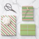 These wrapping paper sheets designs feature Christmas and holidays themed green, white, and red coloured stripes patterns. Festive wrapping paper sheets like these might be used when preparing presents being given when celebrating Christmas.