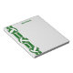This volleyball themed notepad features 3 team colour volleyballs with green and white panels overlying vertically orientated green varsity stripes on the left edge - coach's name is customisable - by katz_d_zynes