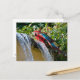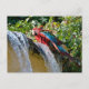 Green-winged macaw next to a waterfall holiday postcard