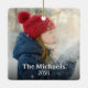 This design features an elegant Christmas photo ornament, a modern brush script, classic greenery, winter pine trees, a woodland forest, botanical foliage, a green and white theme, and a simple calligraphy script, in handwritten style.