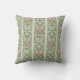 A throw pillow or cushion with art nouveau rust brown clematis flowers and sage green leaves arranged in regency style stripes, with thin green lines bordering plain pale green bands.