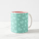 Beautiful green & white hearts two toned coffee and tea mug with a light pink interior.