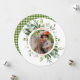 This custom text Christmas | holiday circle photo card features painted watercolor eucalyptus, green leaves and green winter plaid print on the back. Send holiday cheer to your family and friends.