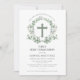 Elegant choice for a girl's First Communion invitation. A sage green botanical eucalyptus wreath frames a simple cross at the top. All of the text can be edited.