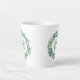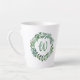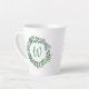 Stylish white latte mug with graphics of a green foliage wreath, on both sides. A green single letter monogram, inside each wreath, is ready to personalise to suit your needs.