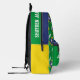 Football sport repeating personalised soccer goal pattern bag. White football splatting as scoring in the goal net with your own name on a green background colour which can be changed if required on the front and over the top, you can add your name, team and or class. Ideal for young soccer or football fans, who supports or is in a team with yellow, blue, white and green colours. Customise with your own choice of name, currently reads Shayden. Art and design by Sarah Trett for www.mylittleeden.com