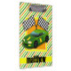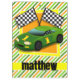 Cool, colourful kid's race car, green, chequered flag, auto racing design on green, yellow, orange, white stripes pattern. Perfect gift for baby, toddler, kids, children, teens, or adults! Personalised the design template by adding a child's name or custom text. Visit our store, Birthday Party House, for more great customisable girl products!