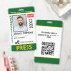 Medium sized 3"x5" vertical press ID with eye-catching yellow and green as the accent colors. Add photo, your news publication logo, the reporter's name, title, the badge ID number and more. This Press ID is in a slightly larger size for easy visibility. Add your QR code to the back as well.