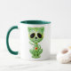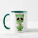 This adorable green kitten design is decorated with swirls and dot patterns. Yellow flower pedals circle the pure black eyes in the tradition of the Day of the Dead sugar skulls. The cat is sitting down, looking forward with its tail waving in the background. The oversized head sits on a tiny body which creates a playful, cartoon like appearance. A five point star sits in the middle of the kitten’s forehead while a bright red and yellow heart appears in the centre of the chest. This cute little cat is a fun and stylish design inspired by the beautiful patterns of Day of the Dead sugar skulls.