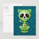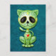 This adorable green kitten design is decorated with swirls and dot patterns. Yellow flower pedals circle the pure black eyes in the tradition of the Day of the Dead sugar skulls. The cat is sitting down, looking forward with its tail waving in the background. The oversized head sits on a tiny body which creates a playful, cartoon like appearance. A five point star sits in the middle of the kitten’s forehead while a bright red and yellow heart appears in the centre of the chest. This cute little cat is a fun and stylish design inspired by the beautiful patterns of Day of the Dead sugar skulls.