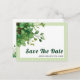 This Save the Date postcard for a spring wedding is absolutely charming! The design has a vintage touch with its lovely greenery placed elegantly on the upper left corner. To add a touch of sophistication, there is a border of pale green stripes that frames the entire card. On the back, there is another greenery border at the bottom, completing the overall aesthetic of this beautiful wedding invitation.