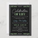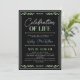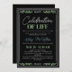 Celebration of life invitation in black with greenery, a blue signature script, and green details without photo.