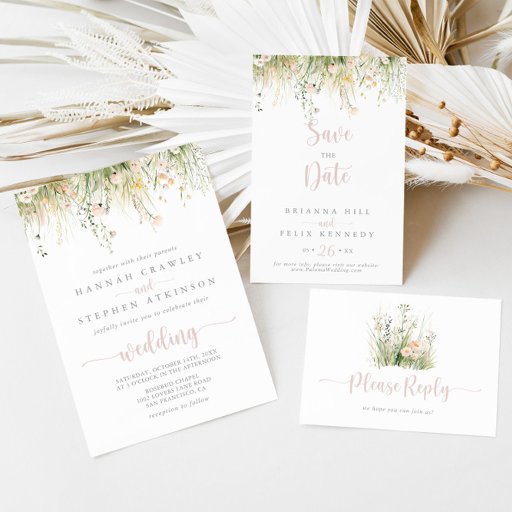 This greenery boho wildflower arch front and back wedding invitation is perfect for a rustic wedding. The design features watercolor pink, blush, yellow, and white wildflowers arranged in elegant bouquets.