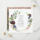 Our modern square save date date card features a trendy (not real) gold geometric centerpiece with watercolor eucalyptus and burgundy and blue flowers. On the back add your engagement photo.