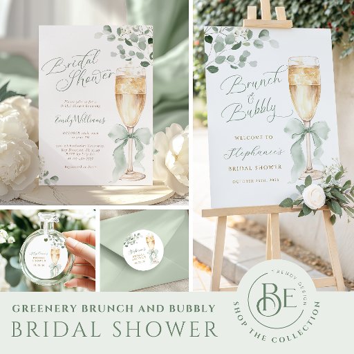 This elegant Greenery Champagne Bridal Shower Invitation features soft watercolor greenery, eucalyptus foliage, and a delicate coquette green bow for a fresh and romantic look.