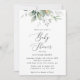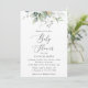 Invite friends and family in style and set the tone for your special day with this charming baby shower invitation. Design features eucalyptus leaves and greenery on white background.
