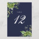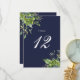 These elegant botanical greenery floral wedding table numbers can be personalised in chic typography on a navy blue background. The cards are printed on the front and back (double-sided). Designed by Thisisnotme©