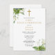 This elegant eucalyptus greenery botanical first holy communion save the date invitation postcard can be personalised with your information in chic typography with monogram initials on the reverse. Designed by Thisisnotme©