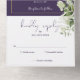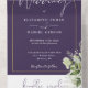 All in one wedding invitation featuring botanical greenery rustic leaves falling across a gold arch enclosing elegant typography on a purple background. The invitation includes a perforated RSVP card that can be individually addressed or left blank for you to handwrite your guest's address details. Designed by Thisisnotme©