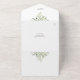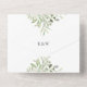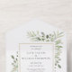 All in one wedding invitation featuring elegant botanical watercolor greenery leaves and a chic gold frame border. The invitation includes a perforated RSVP card with your wedding site QR code and details. Designed by Thisisnotme©