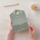 All in one wedding invitation featuring pretty watercolor greenery foliage and elegant modern typography on a sage green background. The invitation includes a perforated RSVP card featuring your wedding website QR code. Designed by Thisisnotme©