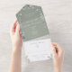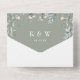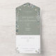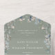 All in one wedding invitation featuring pretty watercolor greenery foliage and elegant modern typography on a sage green background. The invitation includes a perforated RSVP card that can be individually addressed or left blank for you to handwrite your guest's address details. Designed by Thisisnotme©