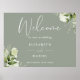 This elegant botanical greenery floral sage green wedding welcome sign can be personalized with your information in chic typography. Designed by Thisisnotme©