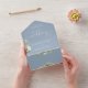 All-in-one greenery floral wedding invitation featuring elegant hearts script typography and monogram initials on a dusty blue background. The invitation includes a perforated RSVP card that features your wedding website QR code. Designed by Thisisnotme©
