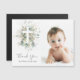Baby Photo Thank You Baptism/Christening Card. This design features an illustration of green and gold foliage in watercolor style. On the green foliage there is an image of a Cross.