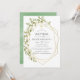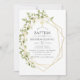 Trendy sage green and white watercolor leaves baptism, christening or dedication invitation with gold geometric frame.