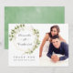 Trendy sage green and white watercolor leaves wedding thank you photo cards with gold geometric frame.
