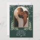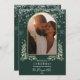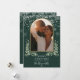 Elegant botanical watercolor greenery gold arch photo Christmas holiday card featuring falling snowflakes on a festive emerald green background. Personalise with your special holiday message, names and year. Designed by Thisisnotme©