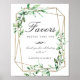 Elegant golden geometric frame adorned with watercolor greenery, personalised wedding "Favours" sign poster. Modern typography design style mixes script with bold type.