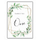 Modern and elegant typography design, table number card. Card features elegant golden geometric frame adorned with watercolor greenery. When ordering table number cards, each card must be numbered and ordered individually.