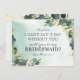 Looking at asking someone to be your bridesmaid for your future wedding, then why not choose these rustic greenery bridesmaid invitation postcards. This personalised invitation will make your friend, sister, cousin, niece, daughter or whoever else you choose feel that extra special.This card features elegant watercolor botanical eucalyptus leaves, splashes of gold, and the wording "I can't say "I do" without you".