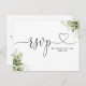 An elegant black and white heart script greenery leaves RSVP card. The reverse features your details and a fun guest song request. Designed by Thisisnotme©