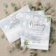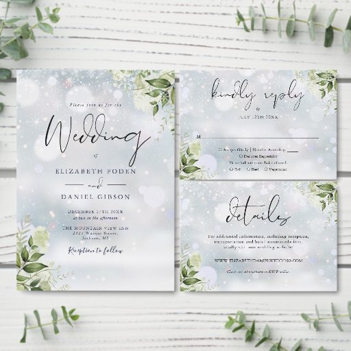 This elegant botanical greenery winter wedding save the date card can be personalised with your information in chic typography on a snowflake background. With your special photo on the reverse. Designed by Thisisnotme©