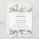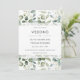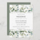 Stylish modern Scandinavian style forest wedding invitations. Featuring leafy greenery foliage eucalyptus leaves, on a clean white background.