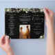 This elegant wedding trifold program features floral greenery and string lights on a black background. Designed by Thisisnotme©