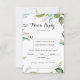 These greenery tropical wedding menu choice cards are perfect for a simple wedding. The design features predominantly green tropical leaves with a touch of pink blush flowers neatly arranged into elegant wreaths and geometric shapes.