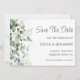 Customisable wedding save the date cards, featuring eucalyptus greenery border on a clean white background.