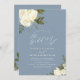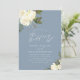 watercolor floral garland of ivory white flowers and green foliage with a dusty blue background.