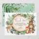 Whimsical thank you card featuring illustration of rustic watercolor greens, foliages and adorable forest animals: fox, bear, deer, raccoon, owl