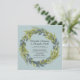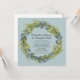 This beautiful wedding invitation features a wreath of lush greenery in lime green and dark teal. The background is a light dusty teal colour.