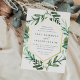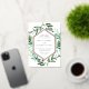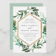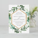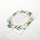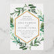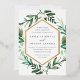 Choose these richly coloured botanical wedding invitations for elegant winter weddings, fall or autumn nuptials, or evening weddings in the summer. Chic design combines natural and geometric elements for a fresh and modern look. Your wedding details appear in white lettering, framed by a gold foil border and surrounded by green foliage, lush leaves, and small white flowers on a crisp white background. Matching items available in our Greenhouse collection.