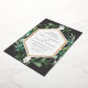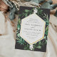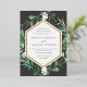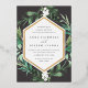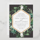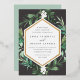 Choose these richly colored botanical wedding invitations for elegant winter weddings, fall or autumn nuptials, or evening weddings in the summer. Chic design combines natural and geometric elements for a fresh and modern look. Your wedding details appear in rich off-black lettering on a white geometric element with a gold foil border, surrounded by green foliage, lush leaves, and small white flowers. A deep earth toned background adds richness and drama. Matching items available in our Greenhouse collection.